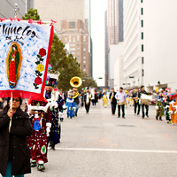 These forms of religious dance as acts of devotion and mortification have long been practiced by Mexican and Mexican-American Catholics. The Houston procession draws groups from throughout Houston and the region, all parts of the state, and some international ensembles, clad in outfits reflecting traditional ceremonial and patriotic garb. While the Virgin is often the focus, some groups will express their devotion to other holy personages or symbols and at other days that are special to the Catholic calendar. The procession in Houston is made up of scores of different types devotional dance groups known as matachines, danzantes and chinelos.