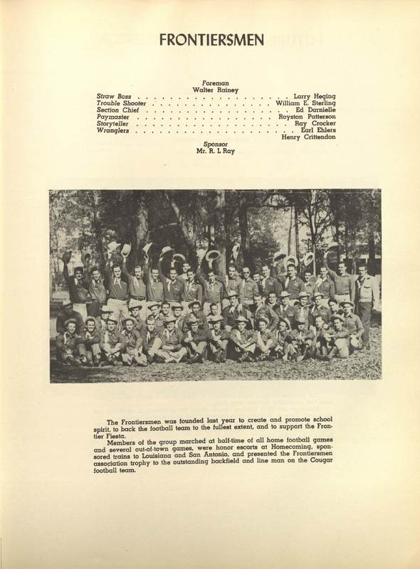 This page from The Houstonian features a group portrait of The Frontiersmen, a group founded in 1948 to promote school spirit.